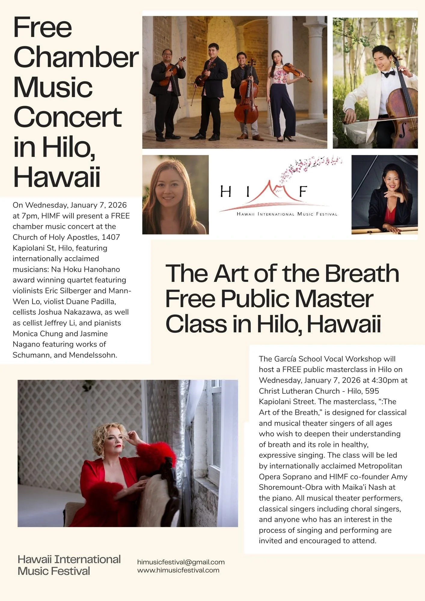 HIMF Co-Founders Eric Silberger (violin) and Amy Shoremount-Obra (voice) will be conducting a free masterclass for selected local violin and vocal students at the University of Hawai'i, Manoa Orvis Auditorium. Don’t miss out on this incredible educational opportunity for students and music lovers of all ages!