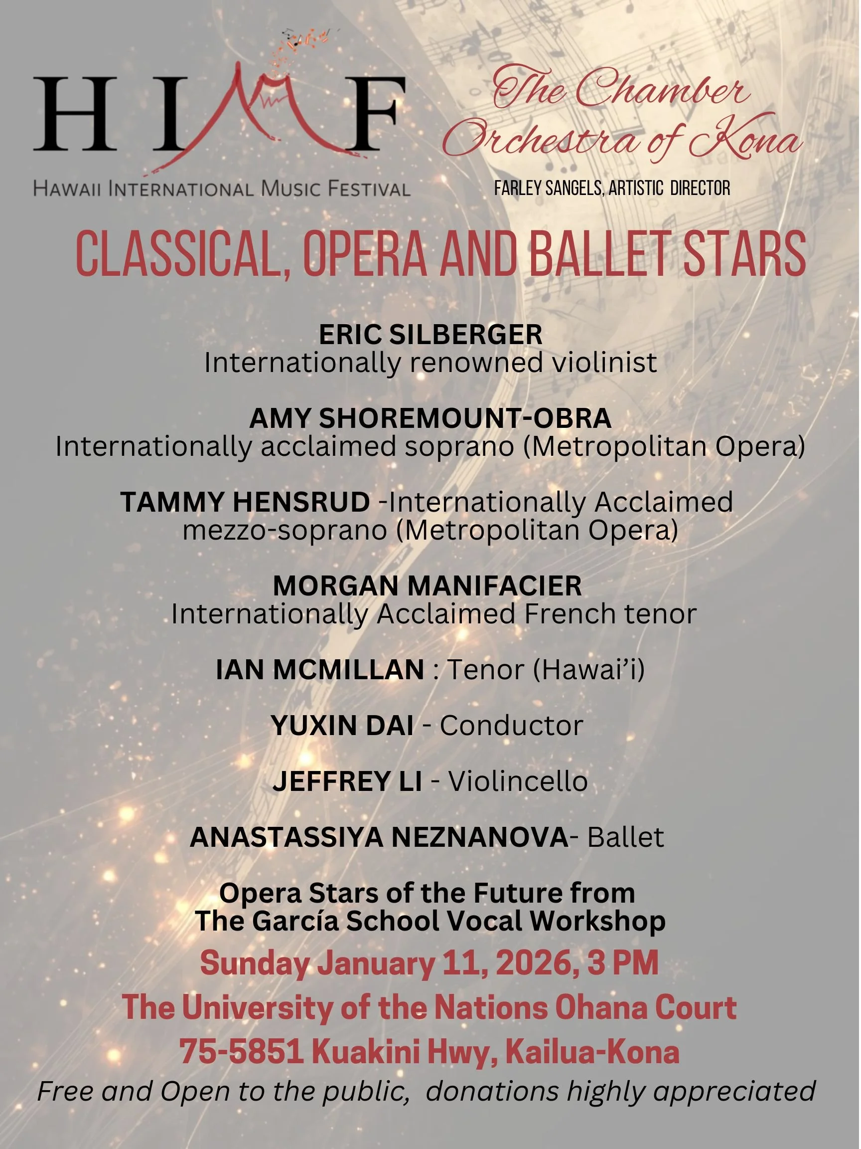 The concert features classical and musical theater music performed by internationally acclaimed virtuoso violinist Eric Silberger; internationally acclaimed Metropolitan Opera Soprano Amy Shoremount-Obra; acclaimed pianist and Kaua'i resident Monica Chung; renowned pianist, music director, coach and Hawai'i Island resident Maika'i Nash; star of Broadway’sPhantom of the Opera Carlton Moe, Ocean View’s own trumpet virtuoso Farley Sangels, and all full-time participating singers from The Garcìa School vocal workshop.